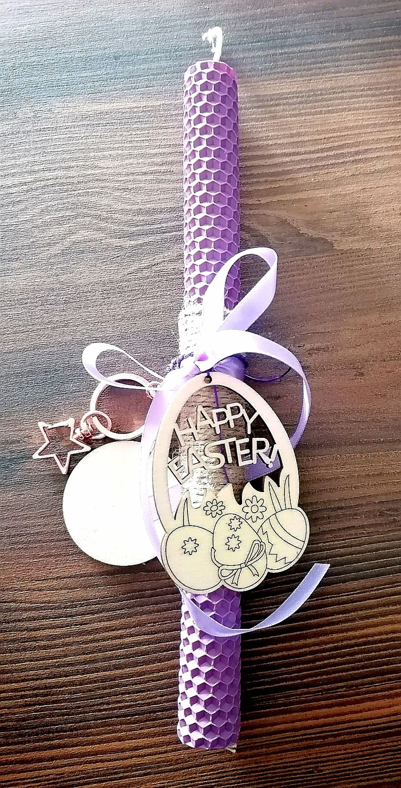 Χειροποίητη πασχαλινή λαμπάδα από φυσικό κερί μέλισσας σε μωβ χρώμα, διακοσμημένη με ξύλινο αυγό χαραγμένο με “Happy Easter”, μεταλλικό μπρελόκ ροζ χρυσό και ξύλινη ταυτότητα με δυνατότητα προσωποποιημένης χάραξης. Δεμένη με κορδέλα μωβ και λινάτσα για μοναδική αισθητική.