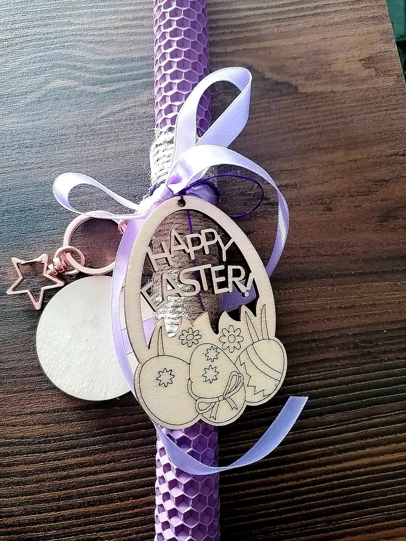 Γιορτάστε το Πάσχα με μια ξεχωριστή, χειροποίητη λαμπάδα από 100% φυσικό κερί μέλισσας σε μωβ απόχρωση, που αναδεικνύει την παράδοση και τη μοναδικότητα κάθε δημιουργίας. Το ιδιαίτερο αυτό σχέδιο στολίζεται με ένα ξύλινο αυγό, το οποίο έχει χαραγμένη ανάγλυφα τη φράση “Happy Easter”, προσθέτοντας μια κομψή και εορταστική πινελιά.